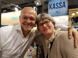 Dan treffen we Sandra J. Paul aka Joanne Carlton. Wat heb ik genoten van Hartslag. Tijdens de koffie probeer ik Linda Jansma over te halen het ook te gaan lezen. Sandra vertelt over haar jeugdboek De duistere school die in februari uitkomt en laat de cover zien. Een plaatje vind ik het. Na heel talentvol koffie gehaald te hebben met de ene beker halfvol en de andere melk zonder koffie, stappen we verder. Even bij Jo Claes die vertelt over zijn boek die net uit is ( Het kainsteken) en waar ik gelukkig daar niks over de omslag hoef te zeggen. Het is een boek zonder zijn vaste personages en het speelt zich af in Toscane. Gewoon weer zwaaien en kletsen bij Jan van der Cruysse die zo'n grote smile op zijn hoofd heeft, daar hij snachts een uitstekende scène had geschreven voor zijn boek.
